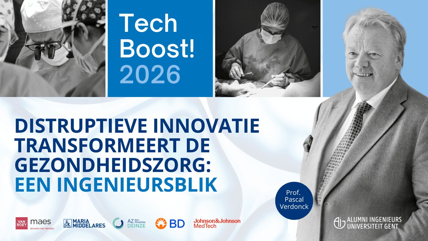 Op donderdag 5 maart brengt TechBoost! 2026 ingenieurs, onderzoekers en alumni samen in het UFO rond technologie, innovatie en maatschappelijke impact.TechBoost! is een jaarlijks terugkerende technische keynotelezing (dit jaar al de 13de editie) georganiseerd door Alumni Ingenieurs UGent (AIG) in samenwerking met onze Faculteit. Met als thema “Disruptieve innovatie transformeert de gezondheidszorg: een ingenieursblik” laat Prof. Pascal Verdonck, internationaal expert in medische technologie, zien hoe ingenieurs vandaag het verschil maken in de zorg.